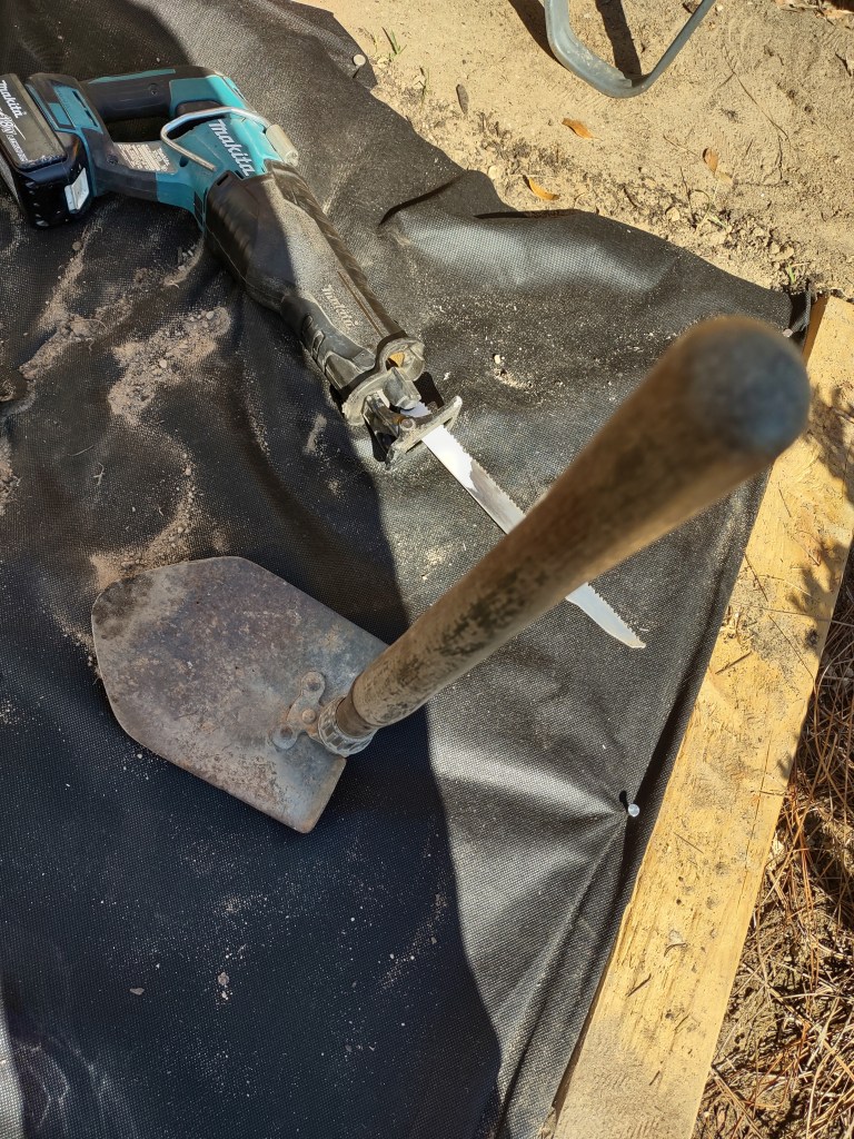 This little shovel is so cool! I knew it belonged to S’s grandfather since WWII, but I had never paid attention to it until last weekend when we used it to build a flower bed. The blade pivots and locks at a 90-degree angle, transforming it into a hoe. How versatile it is!”
