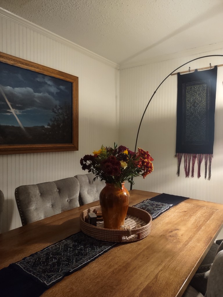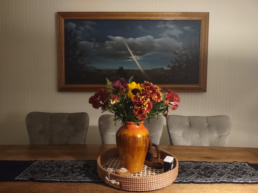 The painting was about Arroyo Hondo’s nature on a moonlit night. The image was captured by S from our yard and we hired an artist from China to “transform” it into a painting. What captivates me in the artwork is the tranquility and authenticity of the scenery, evoking a sense of peace every time I look at.