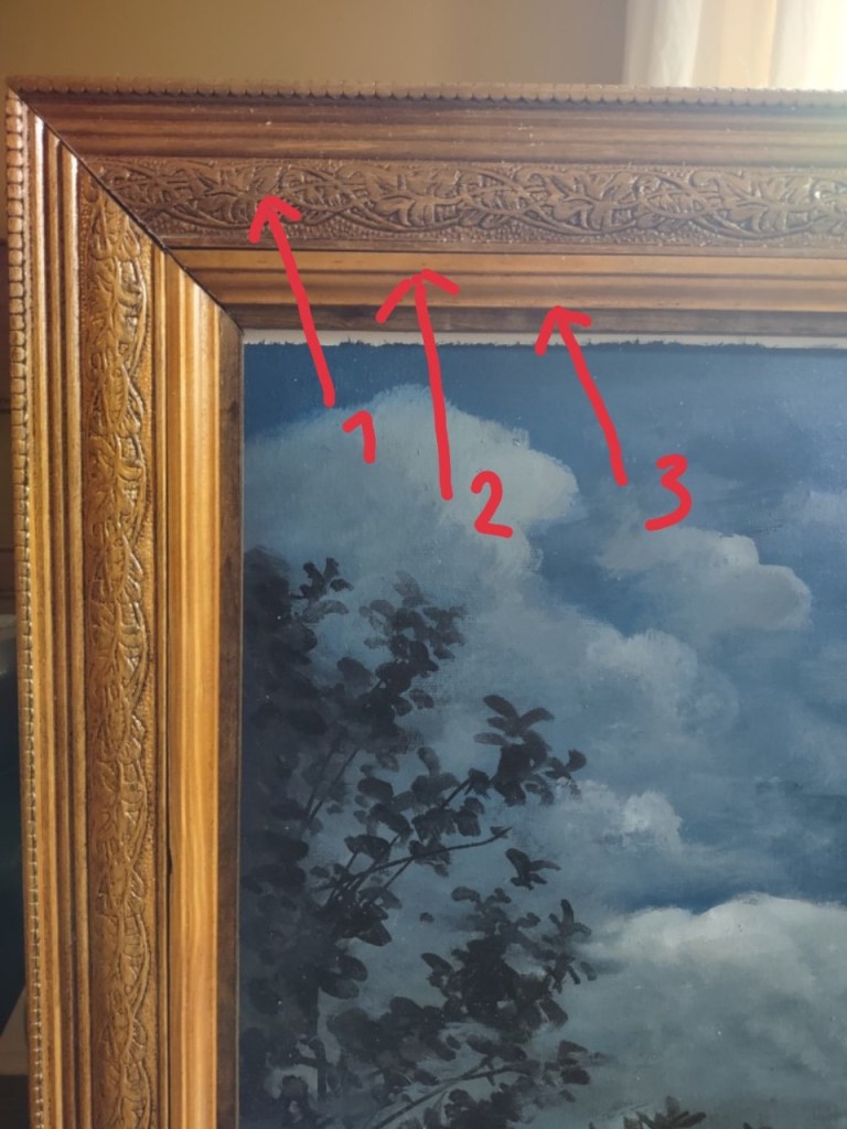 S finally finished the painting frame though it took several months since he hadn’t worked on it continuously. Making it was a PITA. At first, the size of the trims was small, disproportionate compared to the large painting. S had to make another frame to attach to the original one, but, for some reason, it left part of the unpainted canvas exposed. He continued making a smaller frame to attach to the current one, yet, again, it somehow didn’t entirely cover the unpainted canvas. At this point, I decided to “fill in” the remaining blank space. I had never tried oil-painting before, though I used to paint. It had been decades since my last attempt, but I gave it a try. Fortunately, the areas to be filled didn’t require any detailed painting. All I had to do was mix colors to match the right shade of blue and black with the existing ones. I was a bit nervous, but I managed to do it successfully. The colors blended seamlessly.