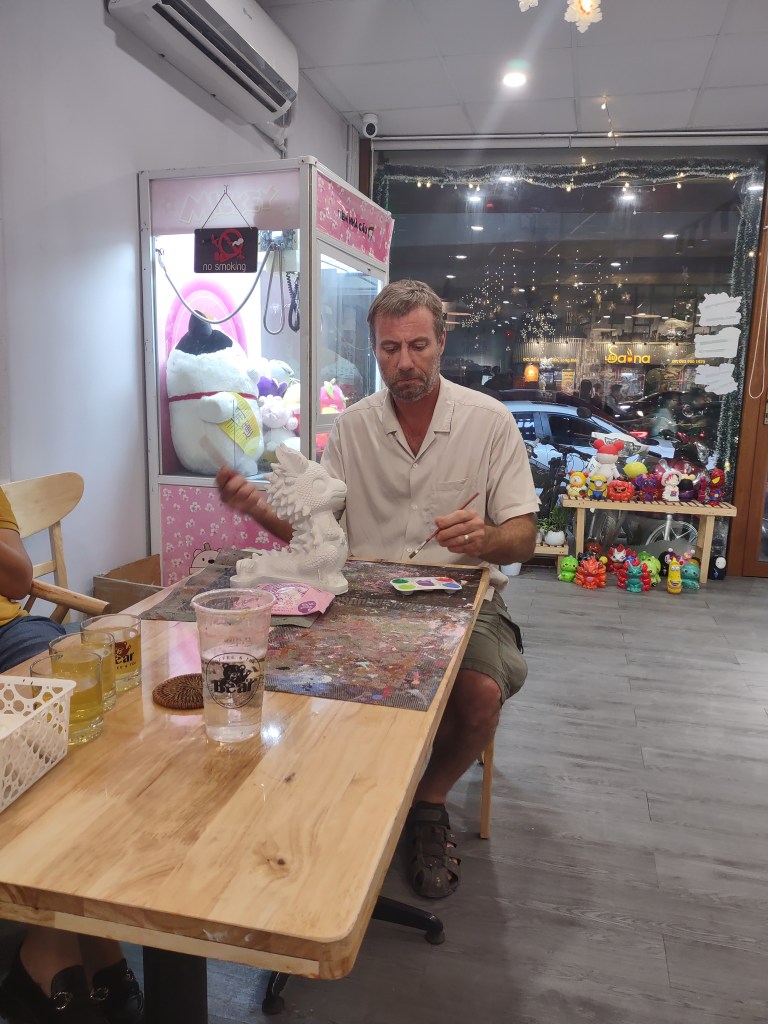 We returned to Hanoi around 9 p.m. Despite that, my sister still had a lot of energy. We headed to a coffee shop where children could enjoy painting statues as well. The coffee shop showed off cute and lovely decor, perfect for teenagers and kids, not my old soul. Anyway, this place offered the best combination of entertainment and enjoying drinks.