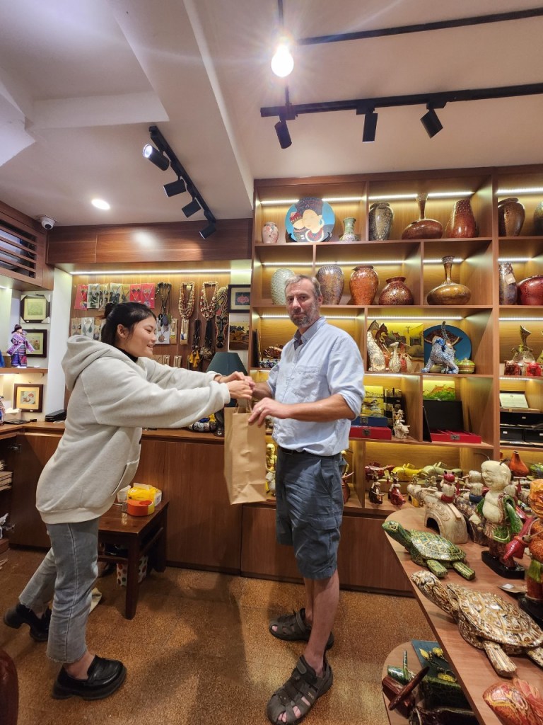 A manager came up to us and started a friendly conversation. She was very pleasant, sharing some insights about the products. She mentioned that the company has its own farms for materials and emphasized that all the products are crafted in Vietnam. There was a sense of pride in her voice, and she was really thankful for customers like us who genuinely appreciate the company’s creations. She even surprised us by wishing a Happy Thanksgiving. She said her daughter was currently studying in the US, which explains why she is aware of the event. It was also particularly thoughtful when she reminded the staff to choose nice boxes for our buys because she knew we bought them as gifts.