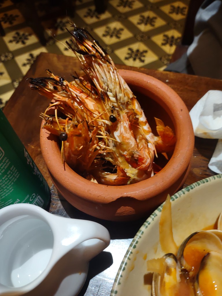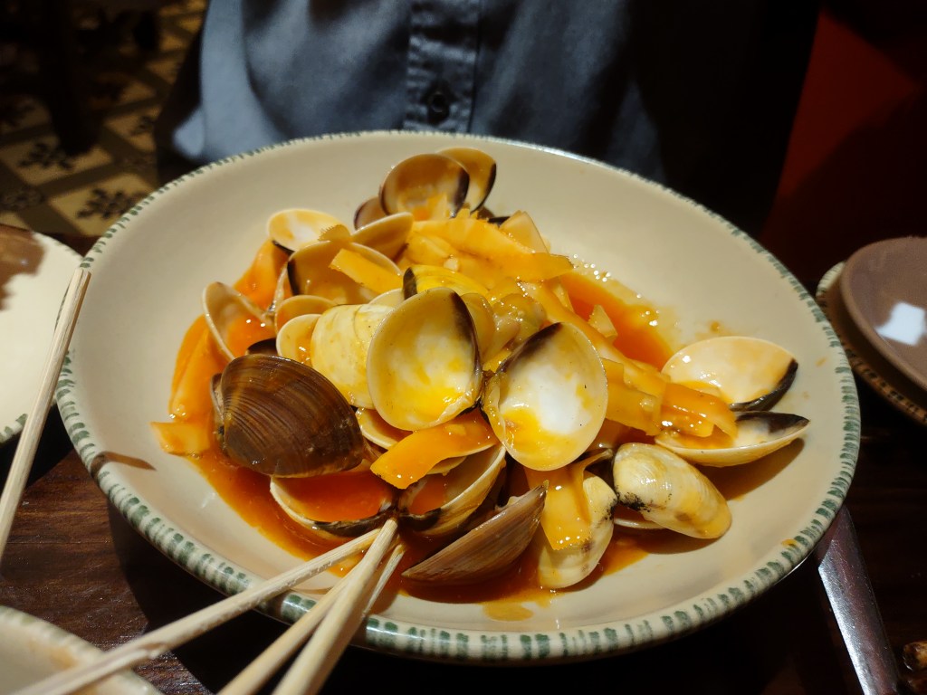 We ordered quite a bunch of food. We had spring rolls, eel soup, sautéed diced beef (Bò lúc lắc) with French fries, clams in tamarind and butter sauce and grilled shrimp. “Bò lúc lắc” is commonly known as “shaking beef” because “lúc lắc” means “shaking”, likely referring to the pan-frying method over flames, involving shaking the pan, making the beef cubes to shake. However, I find its other English name, “sauteed diced beef” more convincing. The word “lúc lắc” resembles the action and sound of shaking dice, and the beef is cut into cubes that look like dice.