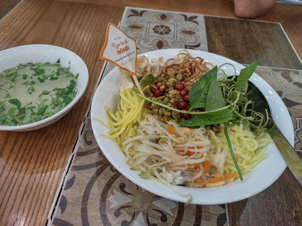When I looked at the menu, I just wanted to order all of them because they all looked delicious. Honestly, Hue cuisine is my favorite due to its spiciness and rich flavors. We ordered grilled pork for S and “Cơm hến”, a bowl with a mix of rice, baby clams, herbs, and pickles for me. Additionally, we tried Ram. I think “Ram”, “Nem rán”, and “Chả giò” are all spring rolls, each known by different names depending on the region – “Ram” in the Central area, “Nem rán” in the North and “Chả giò” in the South.