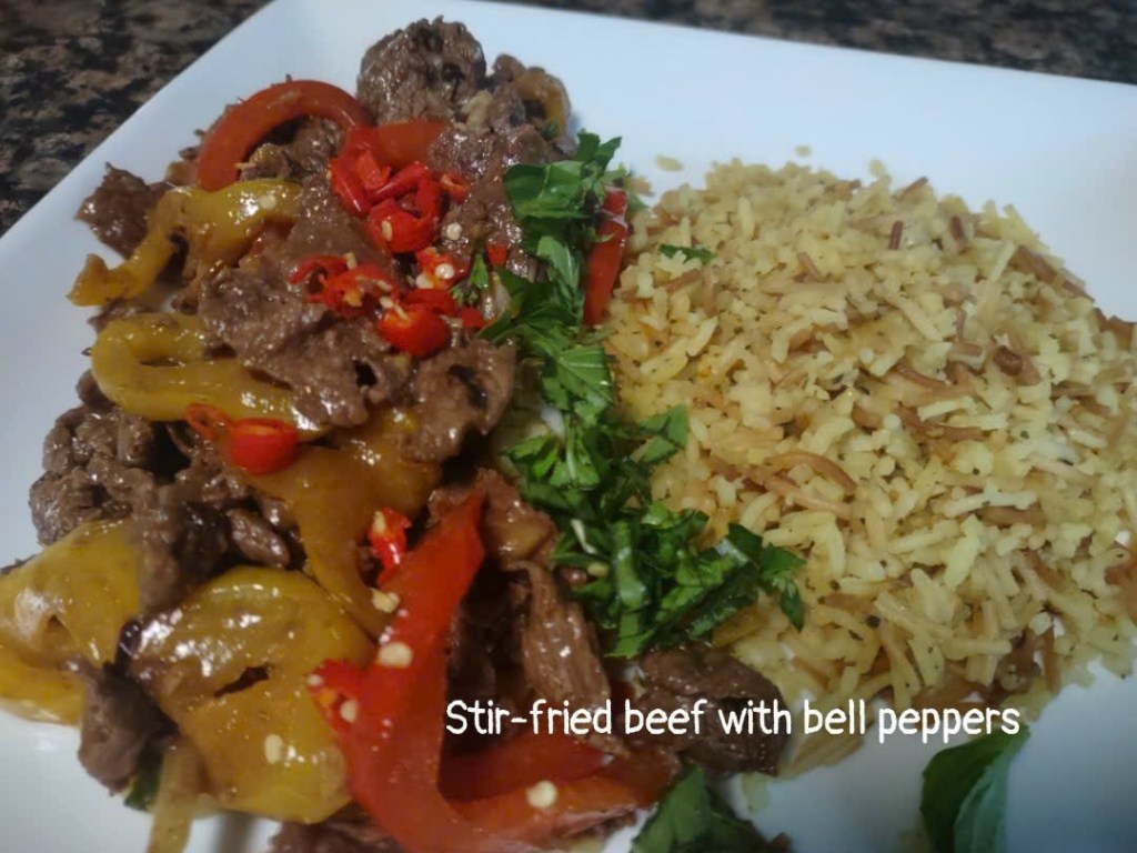 In the evening, cooked chuck tender. While this cut of beef is called “tender”, some people find it less so compared to other cuts, which is why they often recommend slow cooking or roasting. However, from my own experience, sauteeing with the right slicing and cooking method works perfectly for this cut of beef. If you ever try Vietnamese legendary beef – which S playfully named for typical tough Vietnamese beef when he first tried it – you will likely agree with me that any part of American beef is tender. Anyway, here is how I prepared and stir-fried beef: First, sliced beef thinly. This process usually involves marinating with crushed ginger for 15 minutes but I skipped it. Next, sautéed crushed onions and garlic, then threw in the thin sliced beef, seasoned it with garlic salt and oyster sauce and cooked over medium-high heat for just 2 minutes. One thing, I cooked the beef in small portions to avoid too much juice coming out, which would otherwise reduce the taste of stir-fry. Then transferred it to a bowl and used the same pan to stir-fry bell peppers with the same ingredients. Once the peppers were done, mixed them in with the beef, tossed in some fresh basil leaves and hot peppers. Voila, ready to eat!