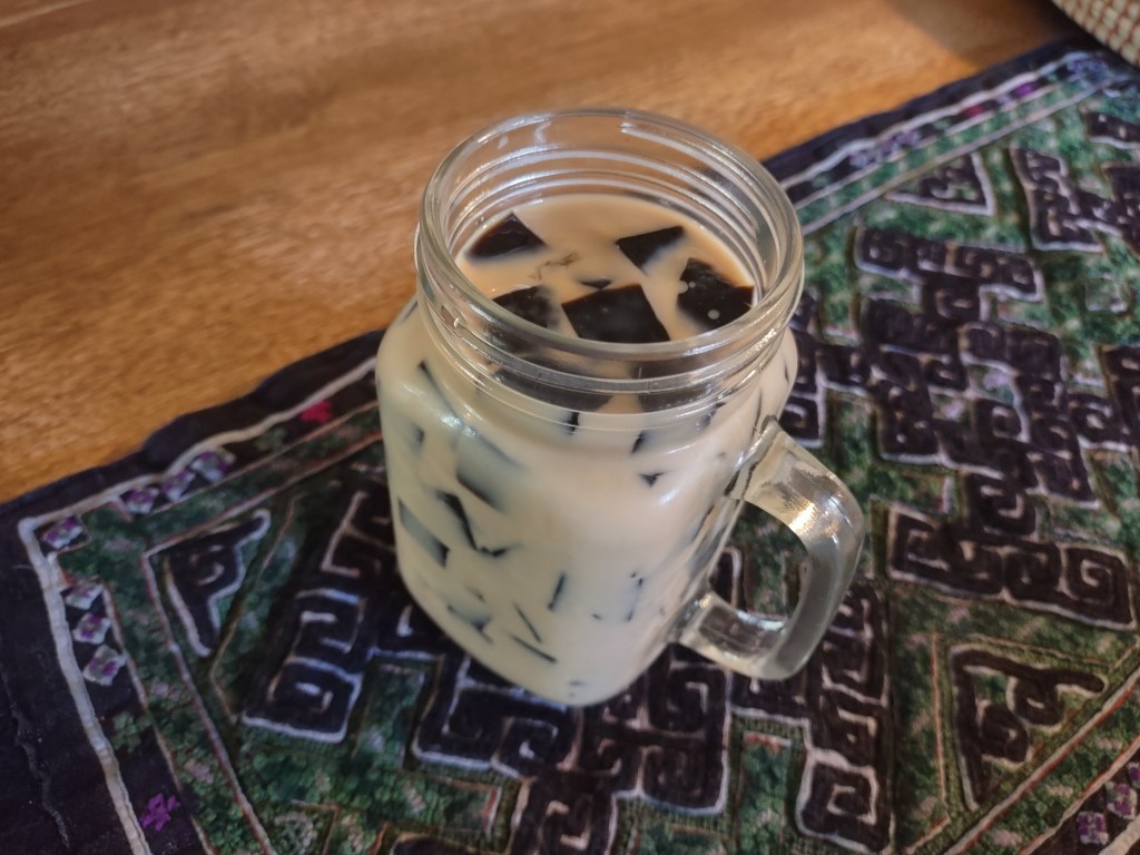 Taking a break, I treated myself to a delightful glass of milk tea with glass jelly, savoring the refreshing taste. I brewed cold sweet black tea, added milk and condensed milk and dropped in glass jelly. The taste was divine – the cooling flavorful tea blended in the milk with refreshing silky jelly quenched my thirst.